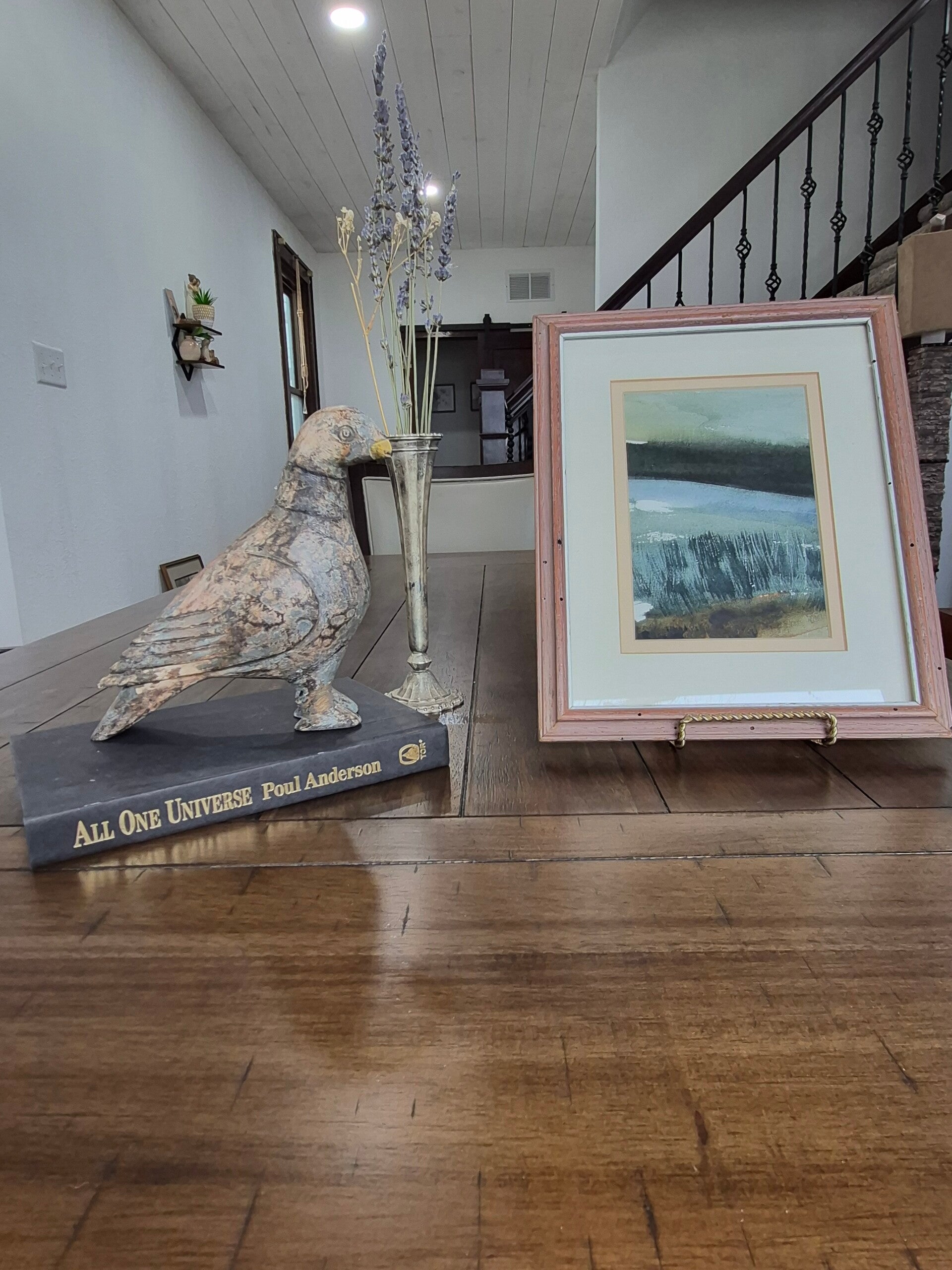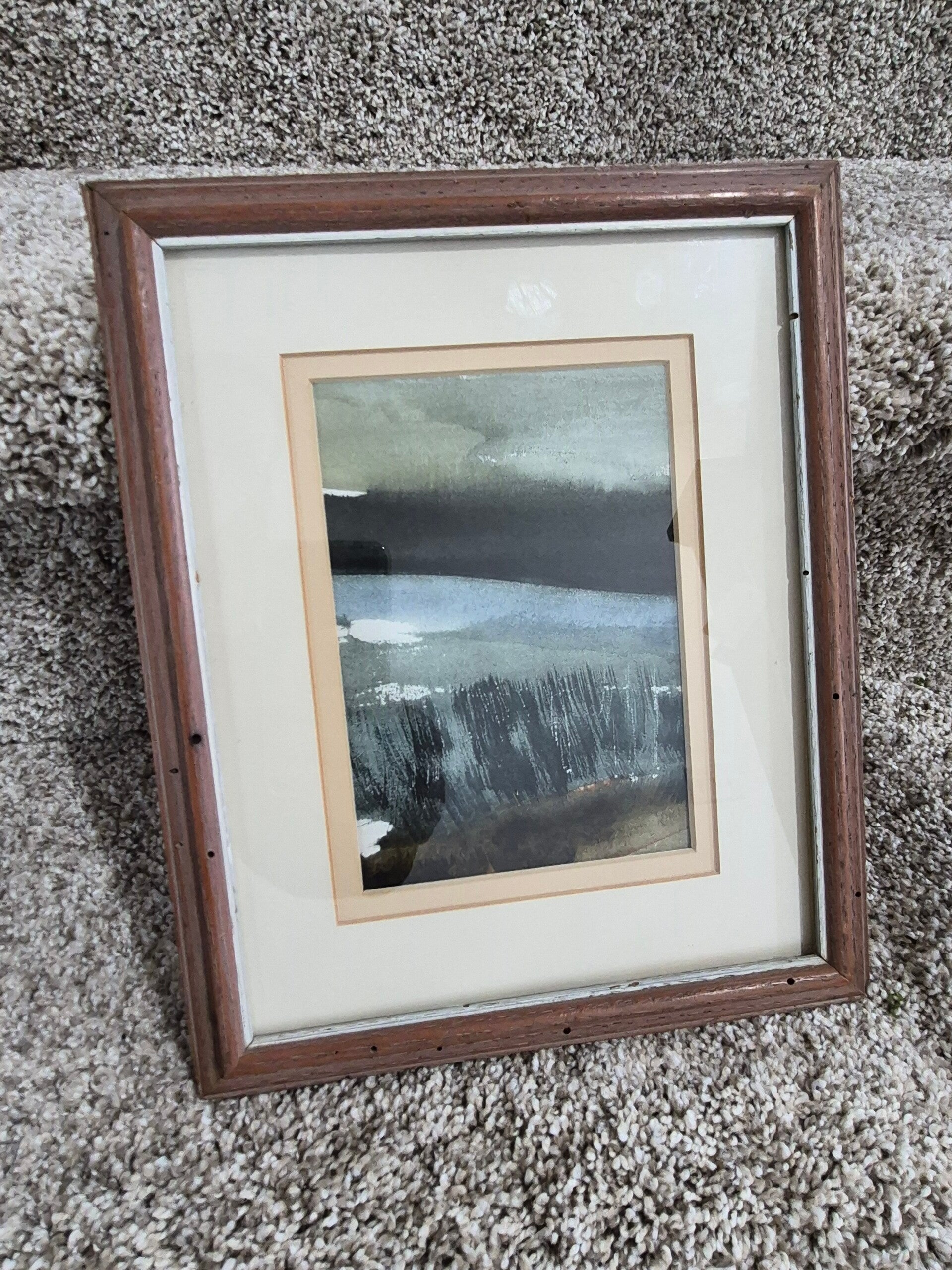 The final piece in the display is an original vintage work of art, an abstract interpretation of a landscape created with layered washes, expressive brushwork, and a soft, natural palette. Its watercolor-like quality lends a sense of movement, atmosphere, and texture, making it a gentle and visually grounding companion to the stronger sculptural elements. Measuring approximately 6.5 x 9.5 inches, it is a versatile size that layers beautifully into the display while adding softness and depth.