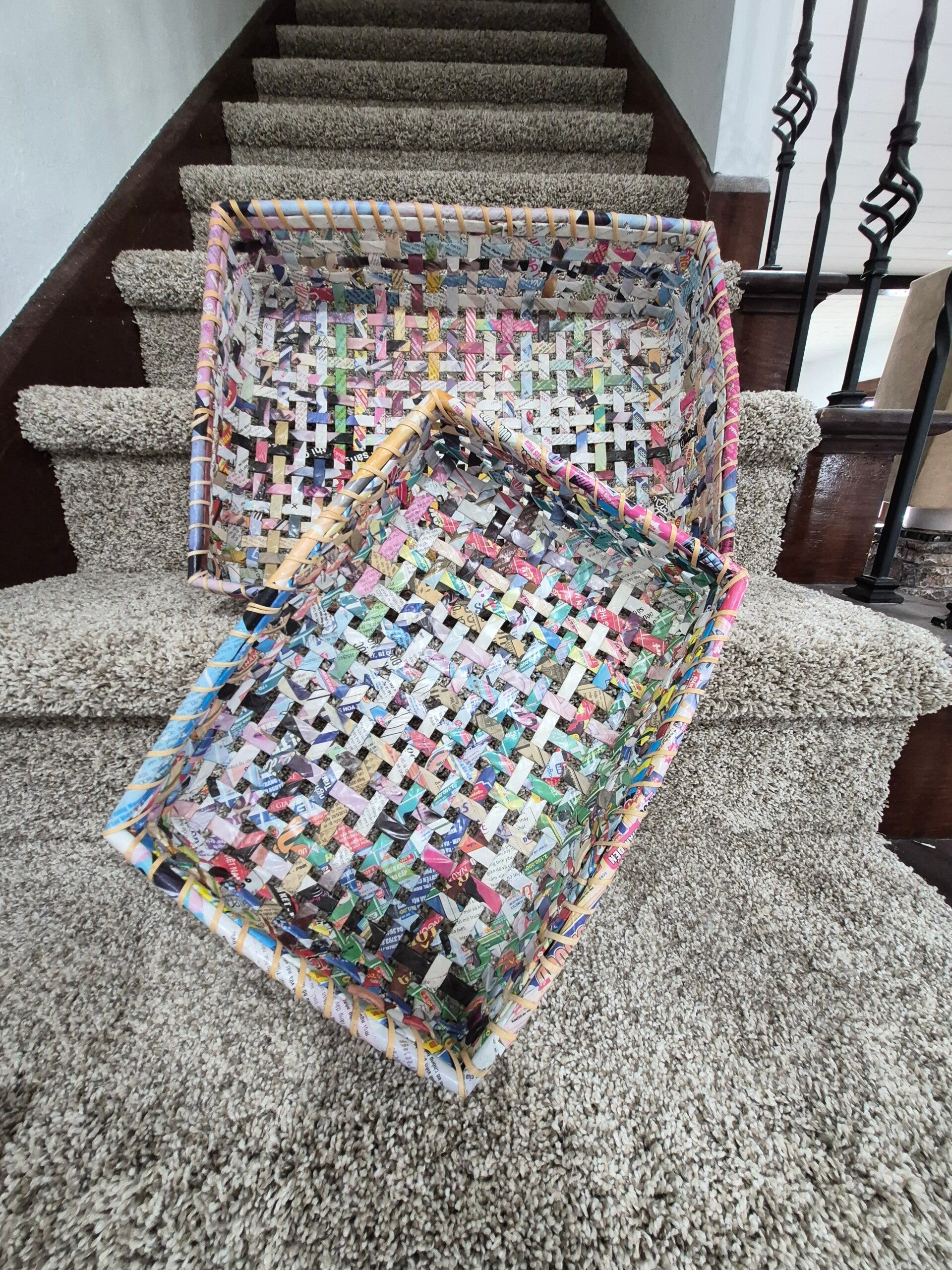 Basket weaving may be an ancient craft, but this piece brings a seriously clever twist with its use of folded strips of recycled glossy magazine and advertising paper—a technique that became especially popular in the late 1990s and early 2000s. The result is a basket full of bold color, playful pattern, and eye-catching texture, turning everyday recycled materials into something unexpectedly stylish and full of personality.